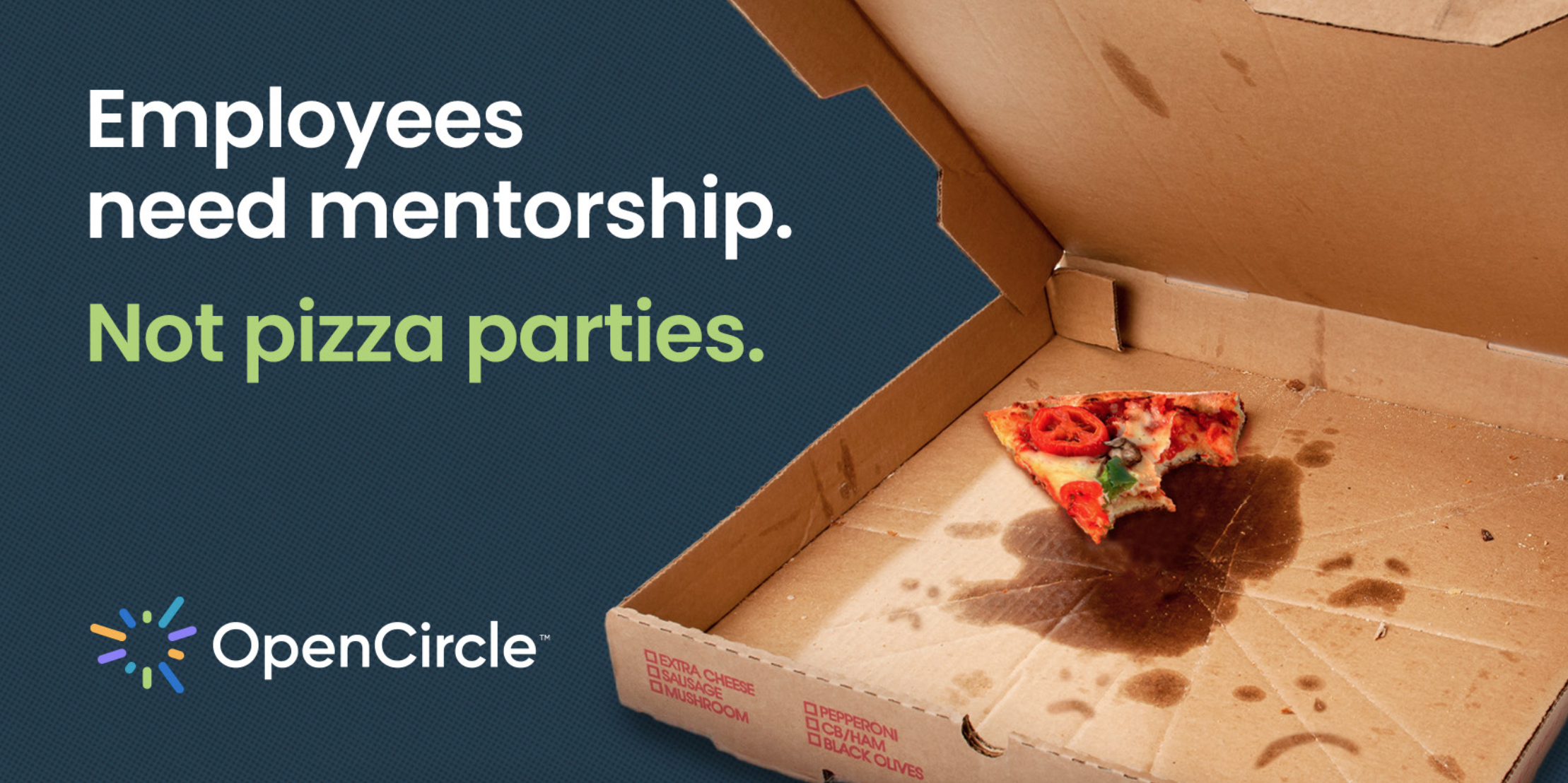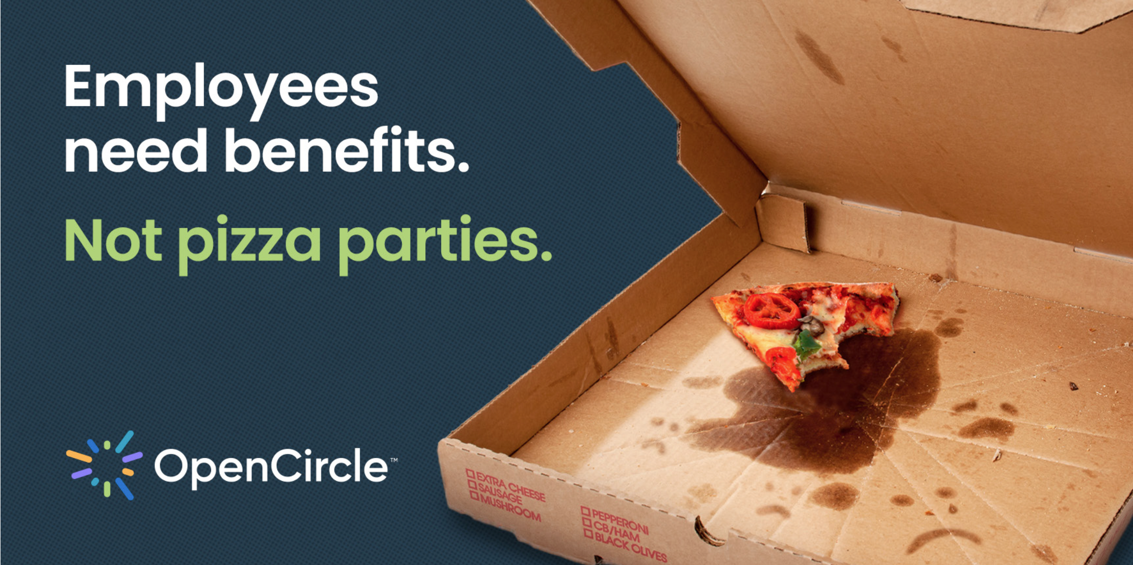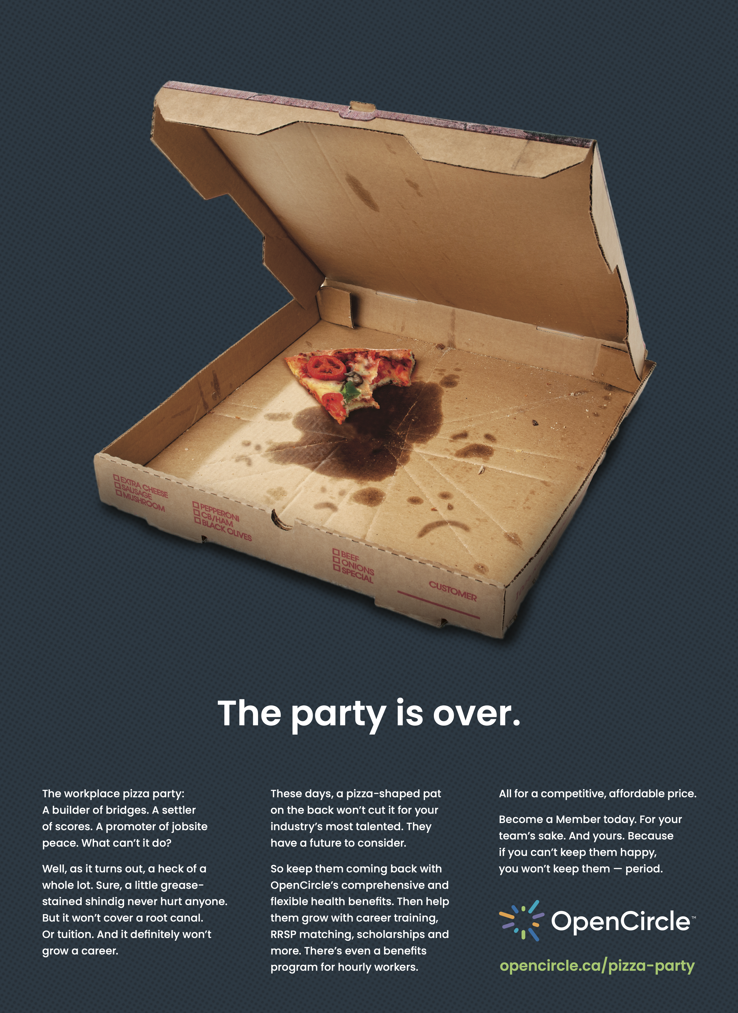 The honest truth is that this concept was born from a meme. We knew office pizza parties had come to represent the kind of employer behaviour people were actively fleeing from (see: The Great Resignation). So we positioned OpenCircle’s benefits and supports as the solution for business owners looking to keep their employees happy — or keep them, period.
